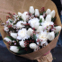 Дизайнерский букет из белых тюльпанов, гвоздик и ваксфлауэра.